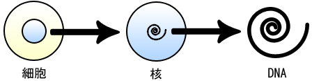 すべての生物は細胞をもっています。この細胞が分裂を続けている状態を「生きている」と表現します。細胞の中には必ず核があり、核の中には細胞に関するすべての情報がつまったDNAが格納されています。